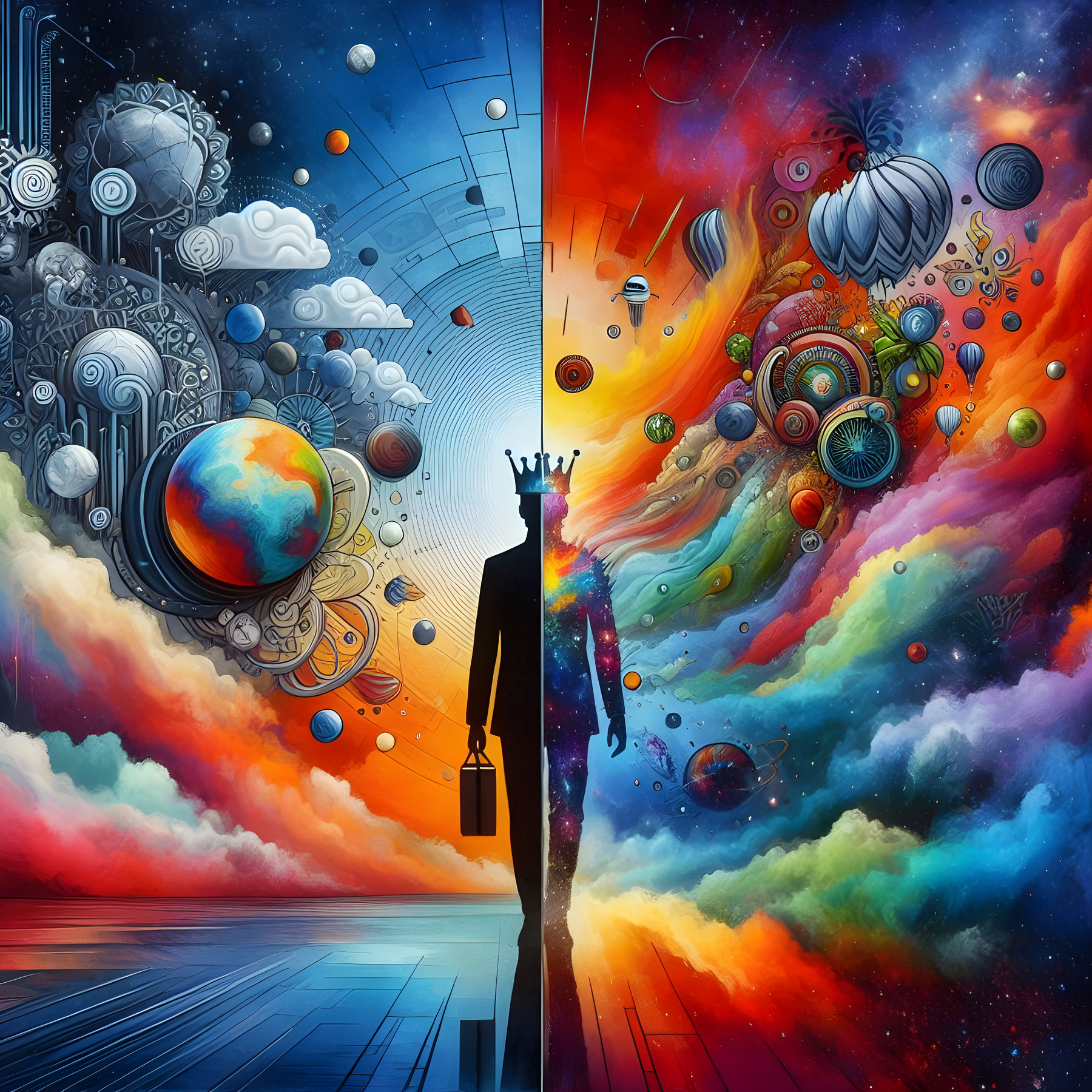 This evocative artwork, "Ambidextrous Soul Throne," serves as a blueprint for unlocking one's spiritual potential. The image portrays a man navigating a dual existence—grounded in the physical world on one side, while ascending in spirit on the other. It is a living testimony to the harmony that arises when order, symbolizing the left brain’s structure, joins forces with the creative chaos of the right brain.