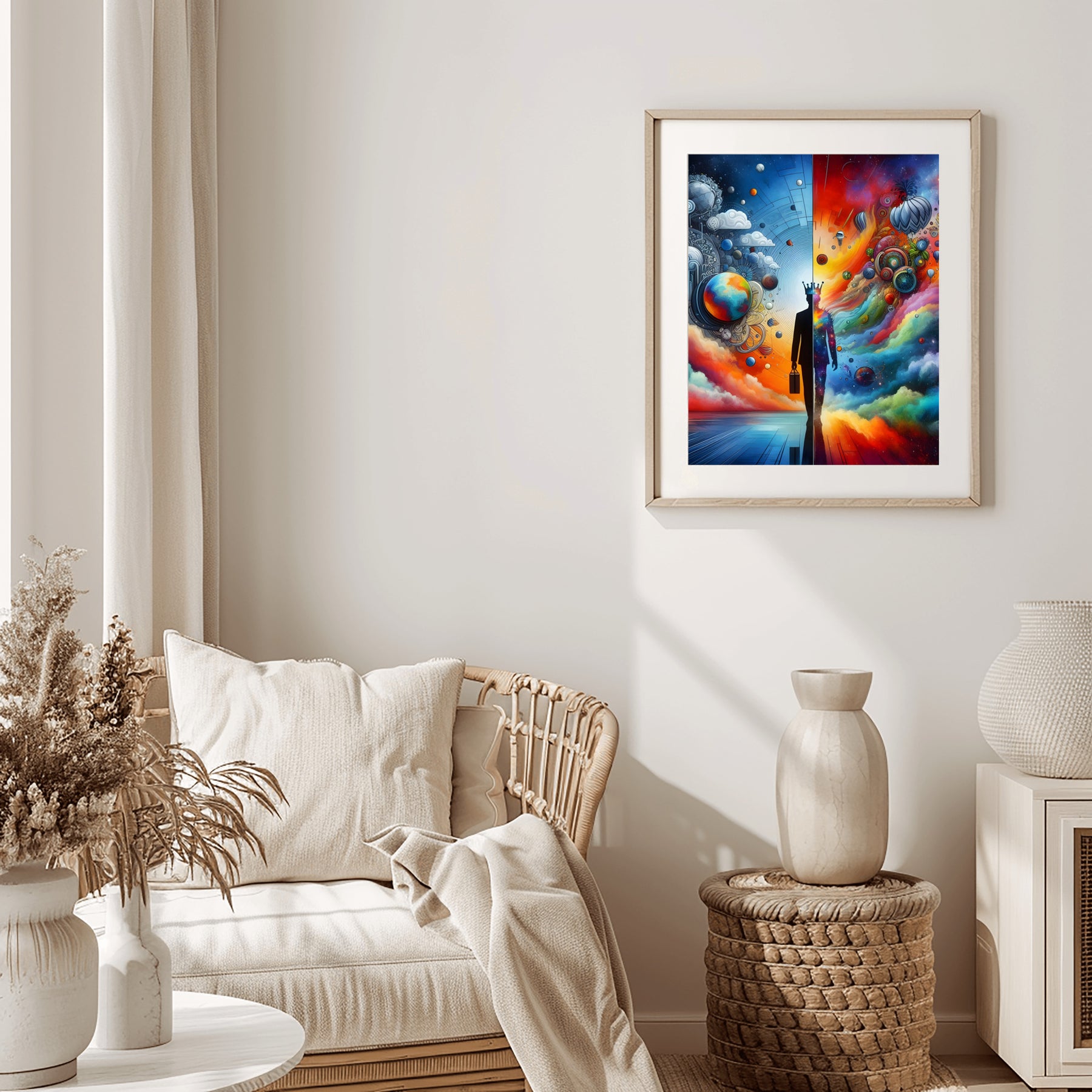 Through the fusion of life's contrasts, this artwork invites you to tap into infinite potential, blending the simplicity of everyday life in the "3D world" with the limitless imagination that transforms creativity into reality. Let it be a beacon of inspiration to create your own new beginnings.