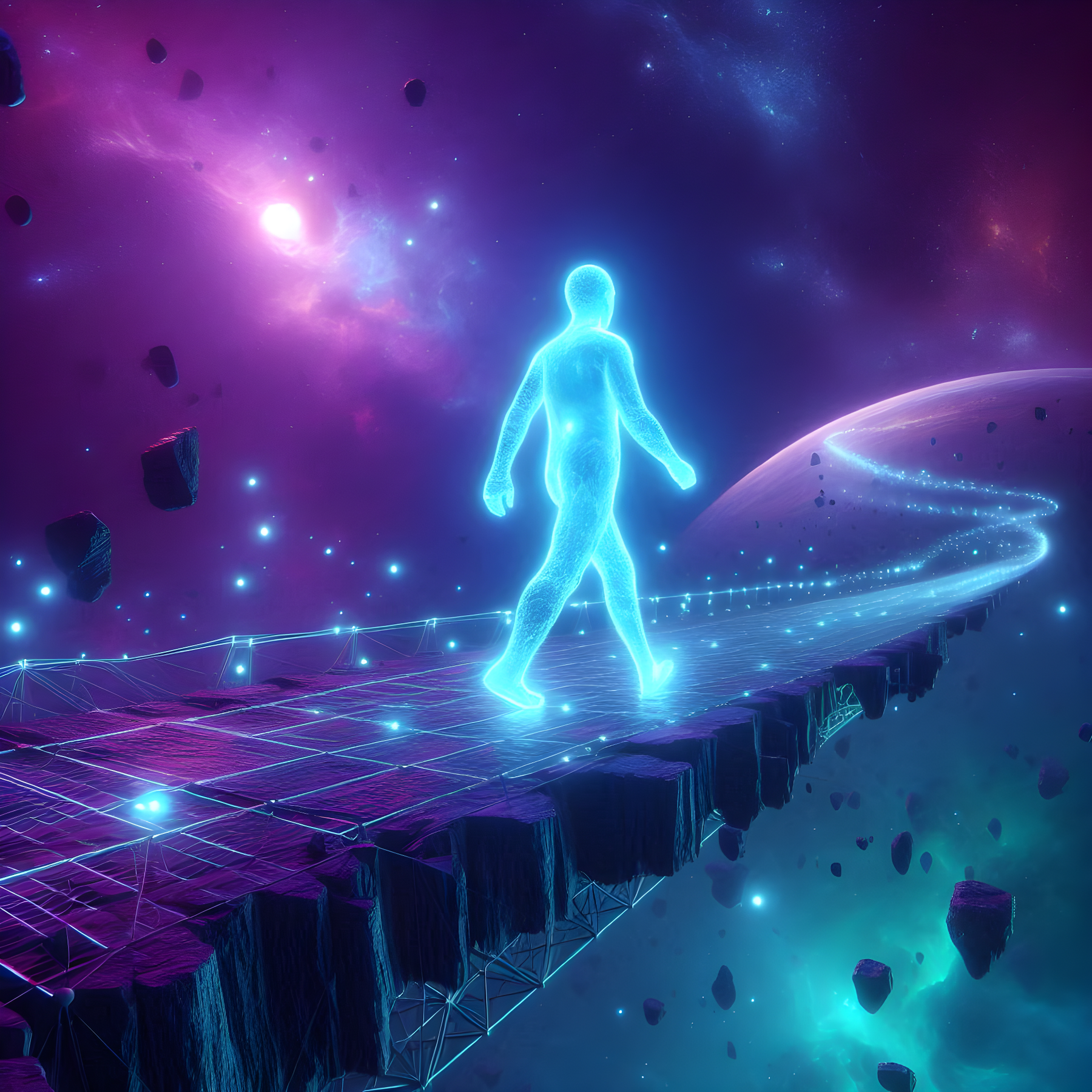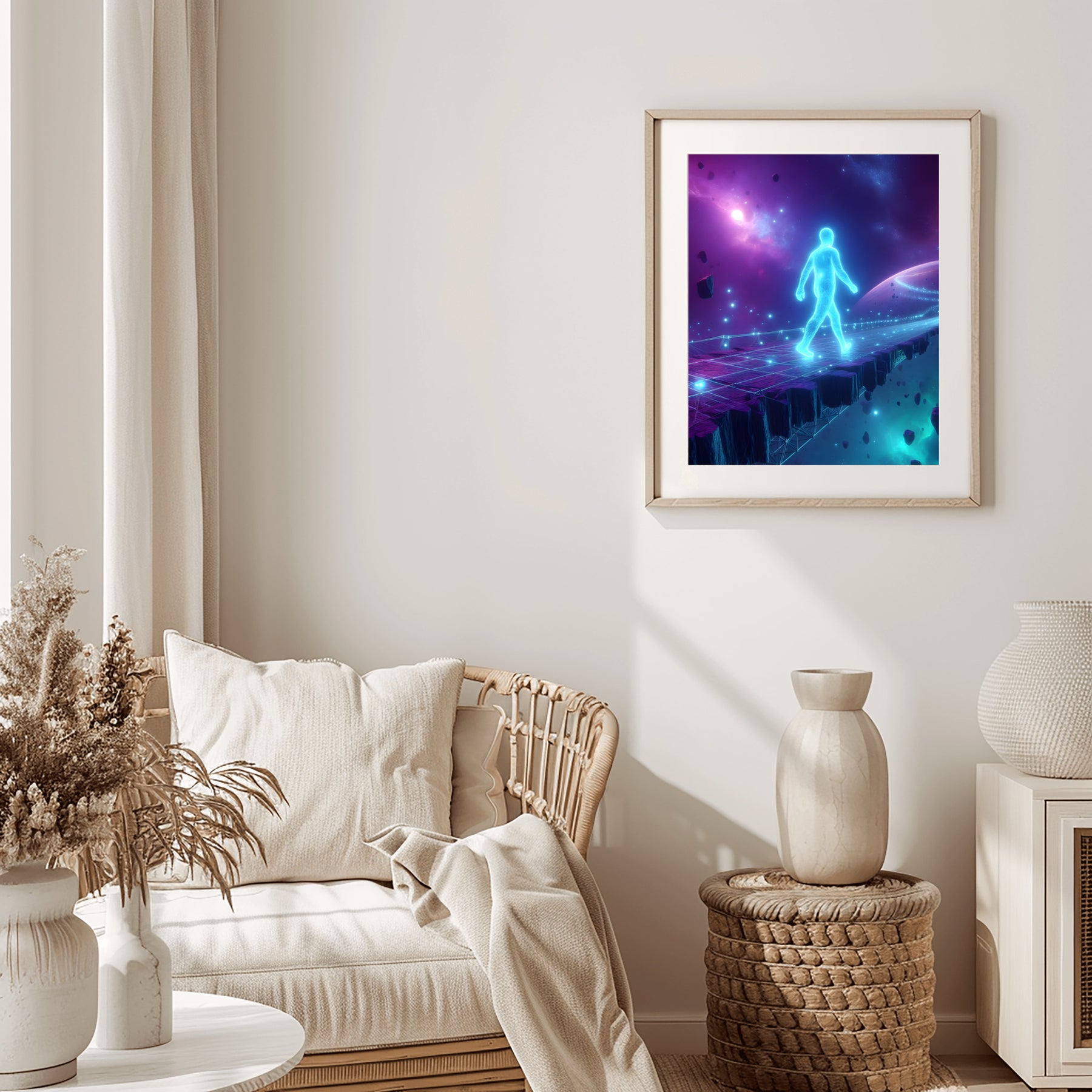 The ethereal figure in the piece walks a floating path through the universe—a luminous bridge unseen yet deeply felt. It embodies the perseverance of moving forward, guided by unseen forces, even amidst life’s challenges. Created to inspire self-reflection and purpose, this artwork serves as a powerful reminder that we are divine beings on a mission, traversing a timeline shaped by determination and guided by higher forces.